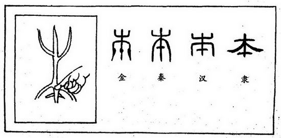金文在“木”的下部標上指事符號,表示這是樹木的根部,即根本的“本”。