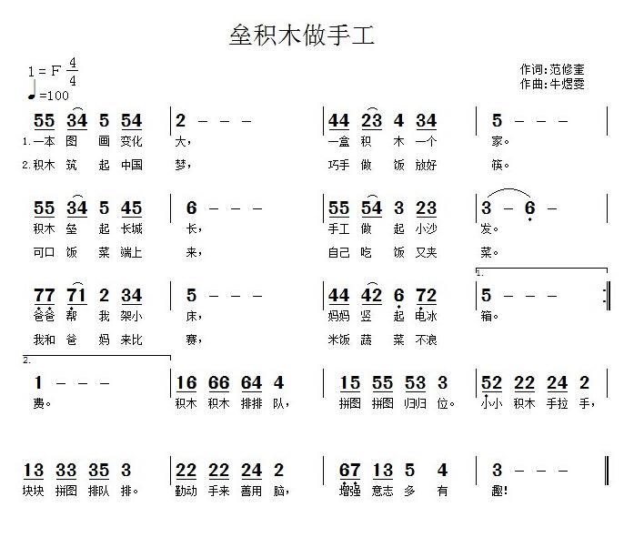 一本圖畫變化大,一盒積木一個(gè)家。積木壘起長城長,手工做起小沙發(fā)。爸爸幫我架小床,媽媽豎起電冰箱。積木積木排排隊(duì),拼圖拼圖歸歸位。小小積木手拉手,塊塊拼圖排隊(duì)排。勤動(dòng)手來善用腦,增強(qiáng)意志多有趣。 積木筑起中國夢,巧手做飯放好筷。可口飯菜端上來,自己吃飯又夾菜。我和爸媽來比賽,米飯蔬菜不浪費(fèi)。積木積木排排隊(duì),拼圖拼圖歸歸位。小小積木手拉手,塊塊拼圖排隊(duì)排。勤動(dòng)手來善用腦,增強(qiáng)意志多有趣。