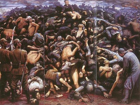 1937年12月,日本軍侵入南京,開始了慘不忍睹的大屠殺。日軍禽獸不如:把南京青年當作刀鞭練習刺殺;活埋南京和平居民;集體屠殺,最后將尸體全部焚化;把殺人當作比賽;日軍將砍下的人頭掛在南京城外的鐵絲網上,還在嘴里塞一根煙頭取樂,濃烈的尸臭和血腥迷漫了南京城,黑暗與死亡的陰影籠罩著驚慌失措的人們。難民們的哭喊聲、驚叫聲,那一雙雙失措的眼睛,更給這城市添了幾分恐慌。令人觸目驚心的掃蕩在街頭巷尾進行著。我仿佛身臨其境般地目睹這場慘無人道的大屠殺,義憤填膺。那是一場中華民族遭受的劫難。面對這樣悲慘的場景,日本兵卻哈哈大笑,實在太殘忍無性了。
