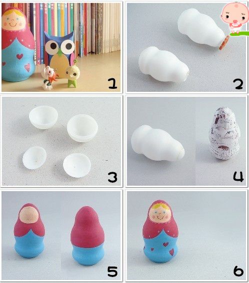 4、套娃基礎形制作步驟:(1)、把頭頂和身體部分用熱溶膠粘合。(2)、整體糊兩遍報紙。6、彩繪上自己喜歡的圖案完成。