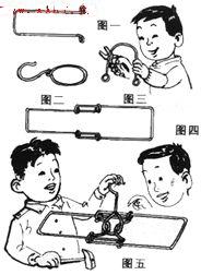 1、制零件:①將鐵絲折成長約200mm、寬50mm框形肩 架,并分別在鐵絲的兩端彎制一個直徑10mm的圓環。②按圖一相同的形狀加工制一個高約200mm、寬40mm的框形肩架。③將兩根長約200mm的鐵絲按圖二折成一對拱形、兩頭為直徑約10mm的圓。④將長約200mm的鐵絲折成一個掛鉤,其尾部為一個直徑約30mm的圓(圖三)。