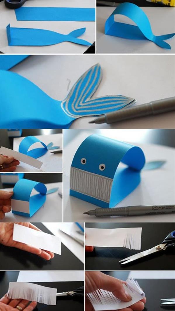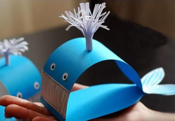 下面我們就要剪紙制作一條可愛的藍色噴水鯨魚,傻乎乎的樣子,徹底顛覆我們心目中海中霸主的形象啊!準備一張長條形的藍色卡紙,按照下面圖解制作出鯨魚的身體,再用白色卡紙制作鯨魚的眼睛和嘴巴。尾巴是用熒光筆畫上去的。另外再用白色紙張剪成流蘇的樣子,插到鯨魚的背部作為噴水。