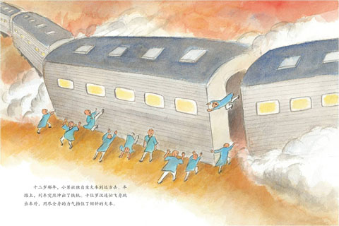 很久很久,火車終于停住了。翻到的車廂里冒出了陣陣濃煙,羅漢們連忙挺身圍住了昏迷的小男孩。