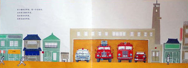 在小鎮的正中央,有一個消防站。站里有云梯車阿高、高壓噴水車阿泵,還有急救車阿快。