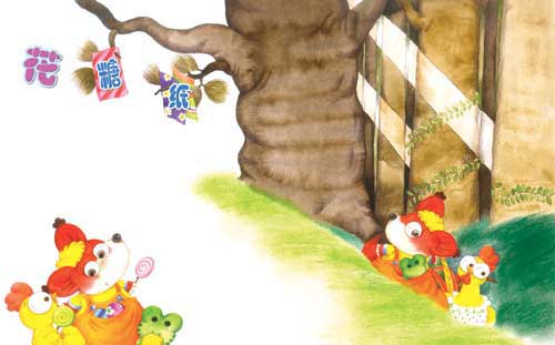看到兩個小伙伴要吵起來了,紅袋鼠從袋子里拿出三根棒棒糖,一人一根。 三個朋友嘴里含著糖,把糖紙穿在松樹枝上,走進了叢林。