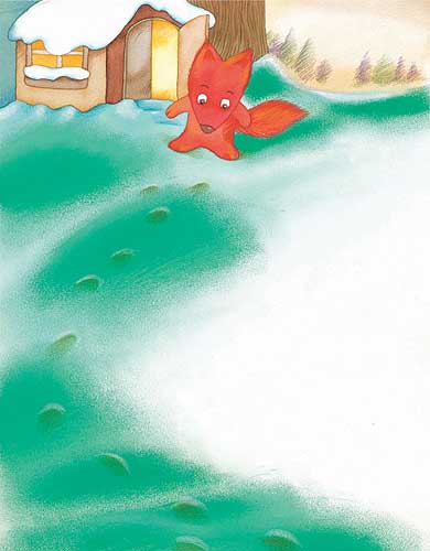 它沿著這些神秘的腳印走了很久很久,突然……腳印不見了!難道腳印飛走了!不,小狐貍是來到了湖邊,湖面已經(jīng)結(jié)冰了。小狐貍想:“如果我筆直朝前走,到了湖的那頭,