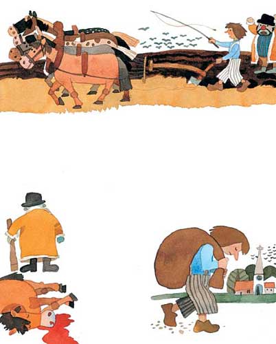 小克勞斯哭了。他剝下馬兒的皮,把它風干,裝進一個袋子里,背到城里去賣。