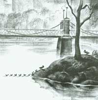 波士頓有一個公園,那里有一個很好的水塘,水塘中間還有一個小小的島。“這地方過夜挺不錯的。”馬洛得太太說。于是,他們就飛了下來。