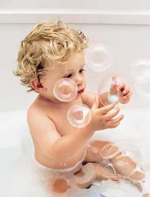Step2:另一只手做成環狀,輕輕將澡盆的水淋在寶寶頭上,注意要避免將水濺到寶寶眼睛里。