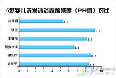 由此讀數對比表格可以看出,強生的產品ph值屬于6款產品中最高的,達9.2,SNOOPY、好孩子和寶健麗ph值是8.7、8.5、8.3,而鱷魚寶寶和孩兒面ph值則6.8、5.3是屬于弱酸性的范圍,分別與皮膚的PH值相似。從清潔的層面來說,堿性產品有著較好的清潔性,但對比嬰兒皮膚的傷害也較大,消費者可以根據寶寶的需要來選擇不同的嬰兒產品。
