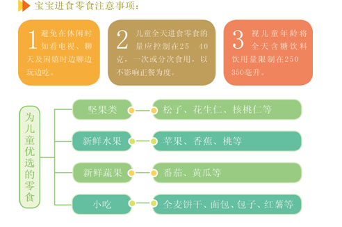 在零食中鼓勵兒童選食堅果、種子類,如松子、花生仁、核桃仁等;選食新鮮水果、蔬果,如番茄、黃瓜;小吃可選食全麥餅干、面包、肉菜包子、紅薯等。