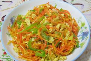 制作方法: (1) 將胡蘿卜、柿子椒切成細絲,打好的雞蛋里加入1湯匙水。