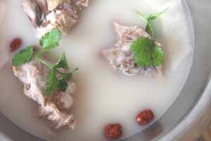 制作方法: 將骨頭洗凈搗碎,與紅棗、生姜同置瓦煲內,加水適量,用旺火燒沸,后用文火燒2小時以上,直至湯稠即可關火。