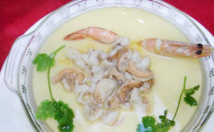 用料:料蝦仁8粒,海帶絲適量,雞蛋珍上,棒骨湯,淀粉,鹽,香油。