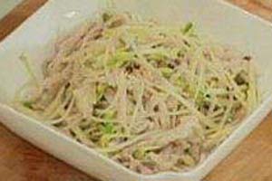 制作方法: 1、將黃豆芽洗凈,冬筍切成粗絲,分別用沸水焯一下,撈出瀝干水分;
