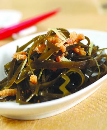 2. 海帶絲放入盤中,放入姜絲、海米,加入醬油,淋上香油拌勻即可。